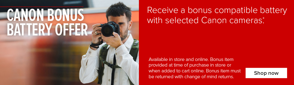 Purchase an eligible Canon mirrorless camera and receive a BONUS camera battery via in-store redemption. Offer available between 11th February and 10th March 2026.
